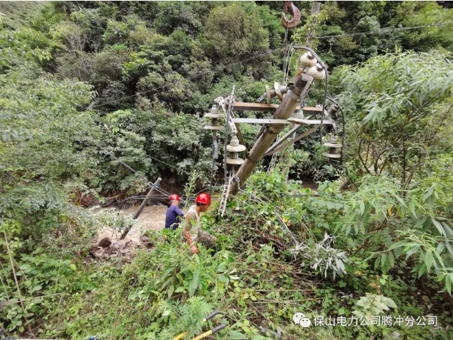 8月19日,猴橋供電所搶修人員正在對(duì)因山洪發(fā)生傾斜的電桿進(jìn)行處理